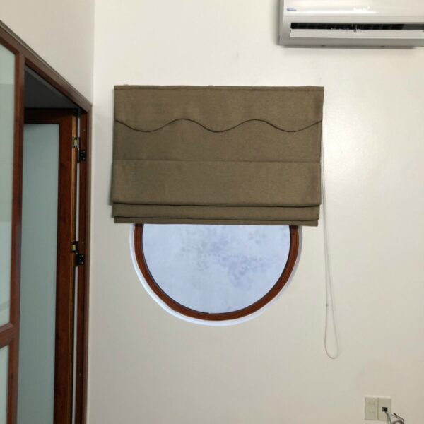 Rèm Roman màu nâu với chi tiết dệt kim: Rèm màu nâu tự nhiên kết hợp với chi tiết dệt kim tạo ra sự ấm áp và sang trọng.