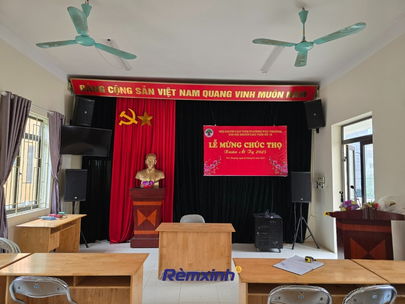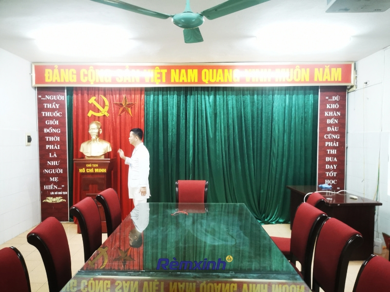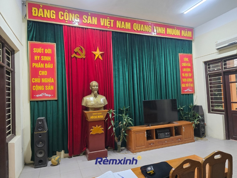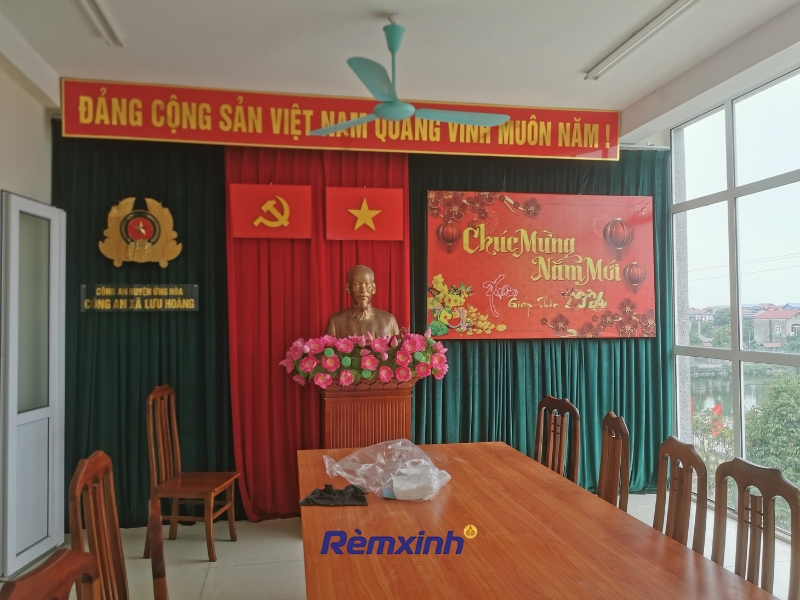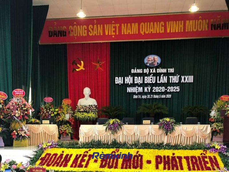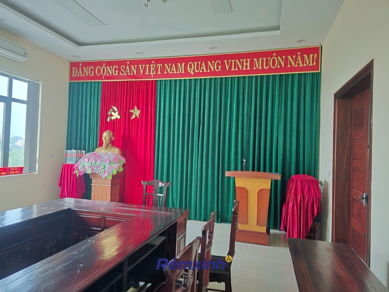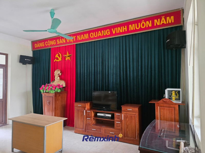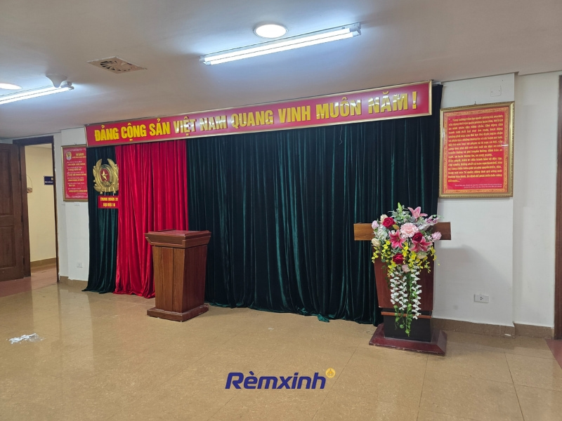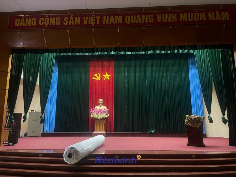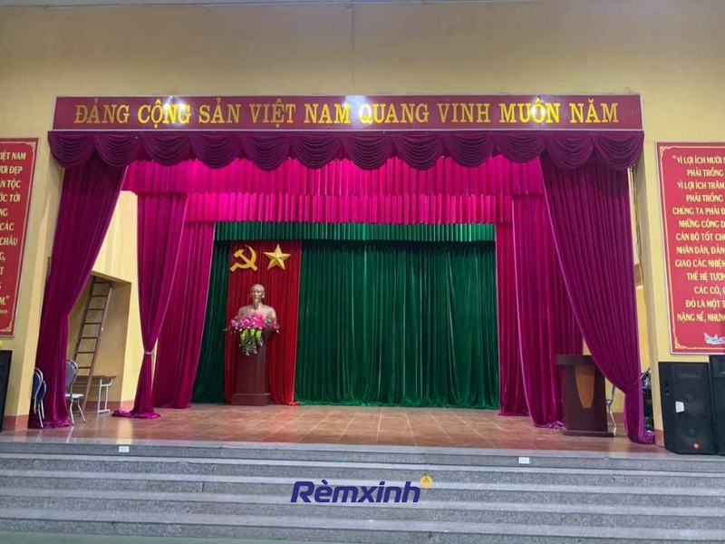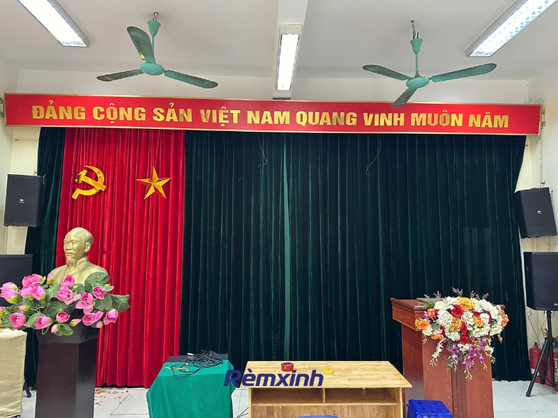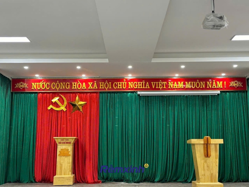 Rèm Xinh cung cấp trọn gói toàn bộ sân khấu bao gồm cả bộ biển khẩu hiệu :ĐẢNG CỘNG SẢN VIỆT NAM và NƯỚC CỘNG HÒA XÃ HỘI CHỦ NGHĨA VIỆT NAM MUÔN NĂM.