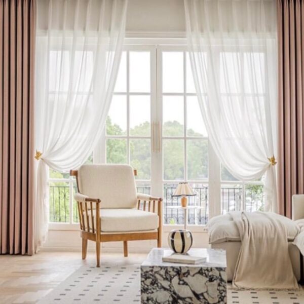 Với tường màu trắng sữa, rèm màu hồng tạo ra một sự hòa quyện nhẹ nhàng, giúp không gian trở nên ấm cúng và mềm mại hơn. Sự kết hợp này thích hợp cho những không gian cần sự thoải mái và dễ chịu, như phòng ngủ hoặc phòng trẻ em.